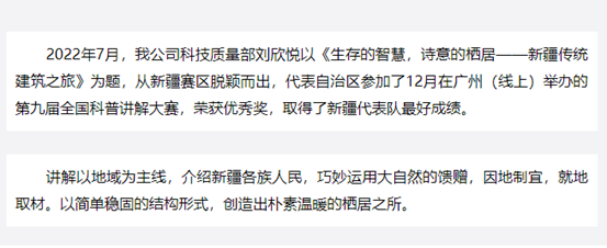 全國科普講解大賽是我國范圍最大、水平最高、代表性最強(qiáng)、最具權(quán)威性的科普講解比賽,至今已成功舉辦9屆。新疆建筑設(shè)計(jì)研究院有限公司,作為新疆城鄉(xiāng)建設(shè)發(fā)展的主力軍,這是第一次參加此類比賽。今后將繼續(xù)以科普推廣的實(shí)際行動(dòng),展現(xiàn)建筑設(shè)計(jì)工作者的責(zé)任與擔(dān)當(dāng),共同建設(shè)團(tuán)結(jié)和諧、繁榮富裕、文明進(jìn)步、安居樂業(yè)、生態(tài)良好的美好新疆。