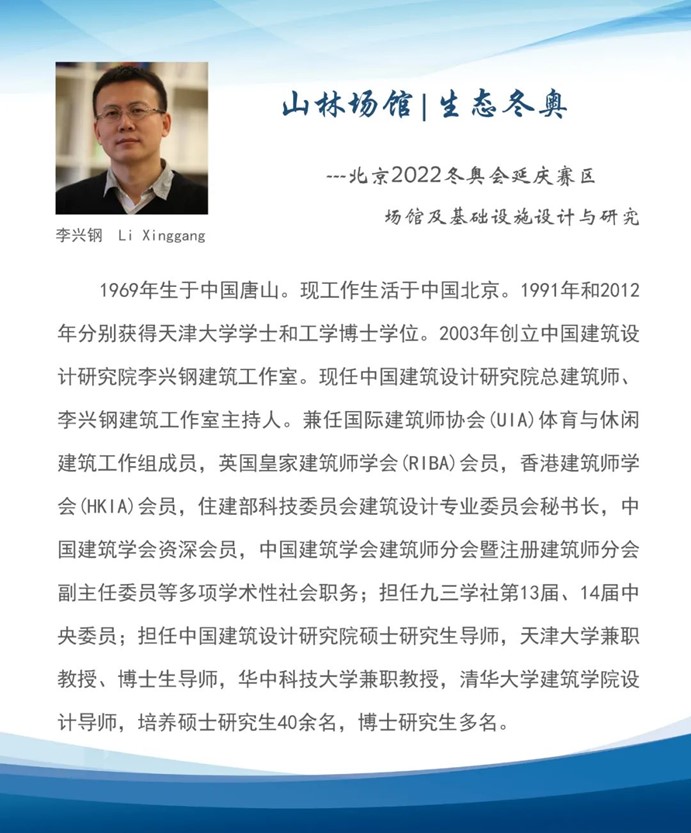 李興鋼大師帶著對(duì)自然與建筑關(guān)系的思考,分享了延慶賽區(qū)”山林場(chǎng)館、生態(tài)冬奧”的設(shè)計(jì)理念, 著重介紹了冬奧會(huì)延慶賽區(qū)各場(chǎng)館及賽道的設(shè)計(jì)實(shí)踐。